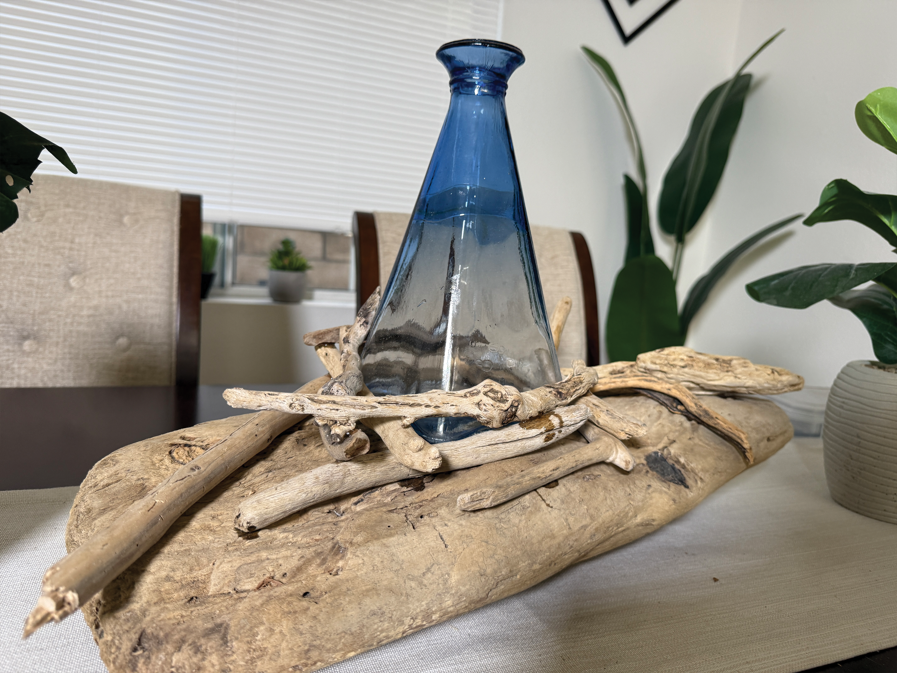 Bring the raw beauty of nature into your home with this one-of-a-kind driftwood centerpiece sculpture, thoughtfully handcrafted to showcase a timeless union of land and sea. At its heart, a stunning antique blue glass vase emerges gracefully from weather-worn driftwood, creating a striking contrast between organic ruggedness and refined vintage elegance.